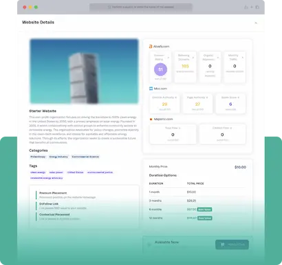 Browse our inventory of 800+ sites. Filter by niche, check the metrics, and select the sites that fit your campaign.
