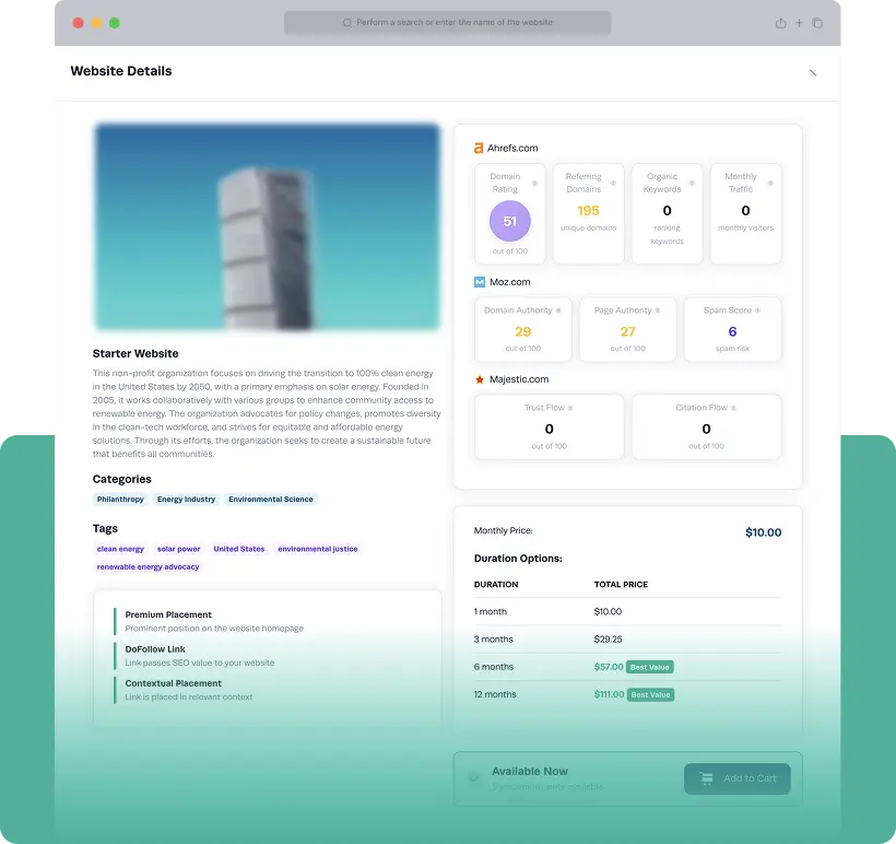 Every site in the network undergoes manual vetting for real traffic (verified via Ahrefs), genuine content, and editorial standards. No PBNs or link farms are used. Metrics are visible before purchase.